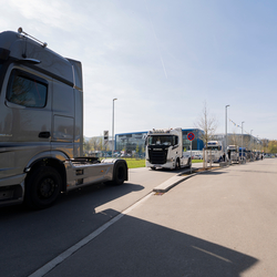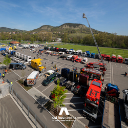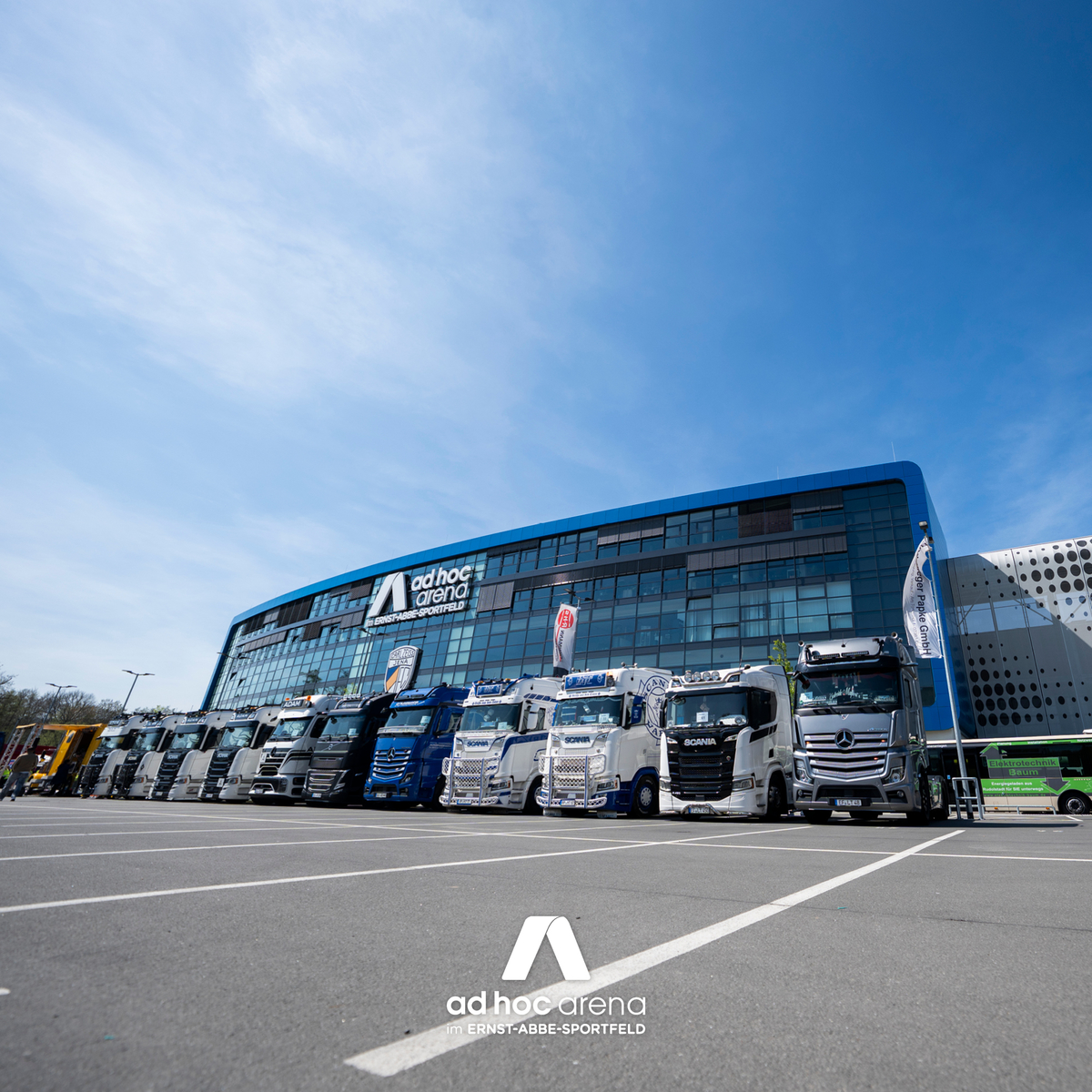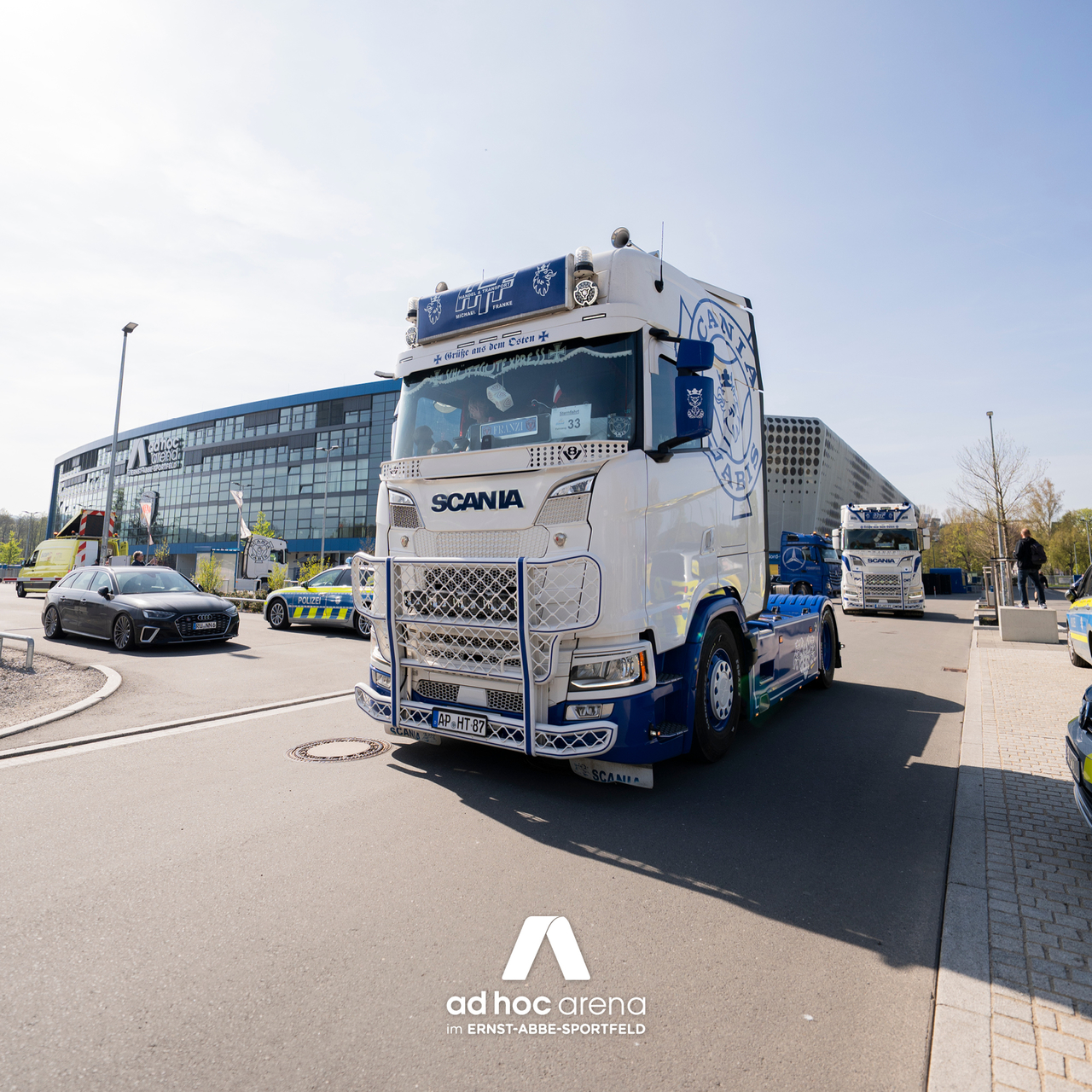 Insgesamt 64 Trucks versammelten auf dem Parkplatz des Ernst-Abbe-Sportfelds, um die schwerkranken Kinder von hier aus in einem beeindruckenden, von der Polizei begleiteten Konvoi zur exklusiv für sie geöffneten Modellbaumesse nach Erfurt zu bringen.
