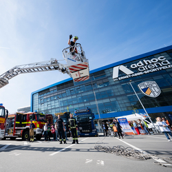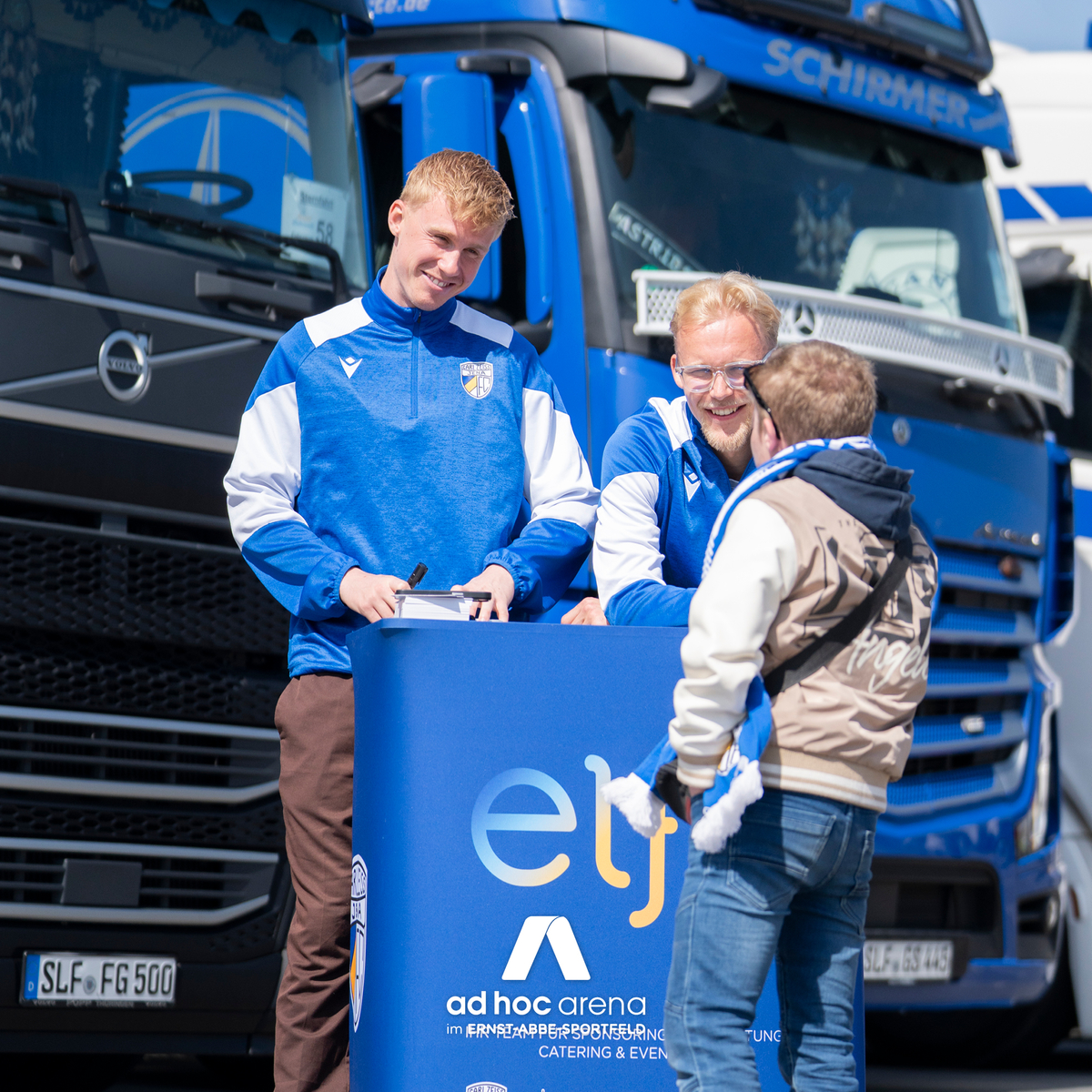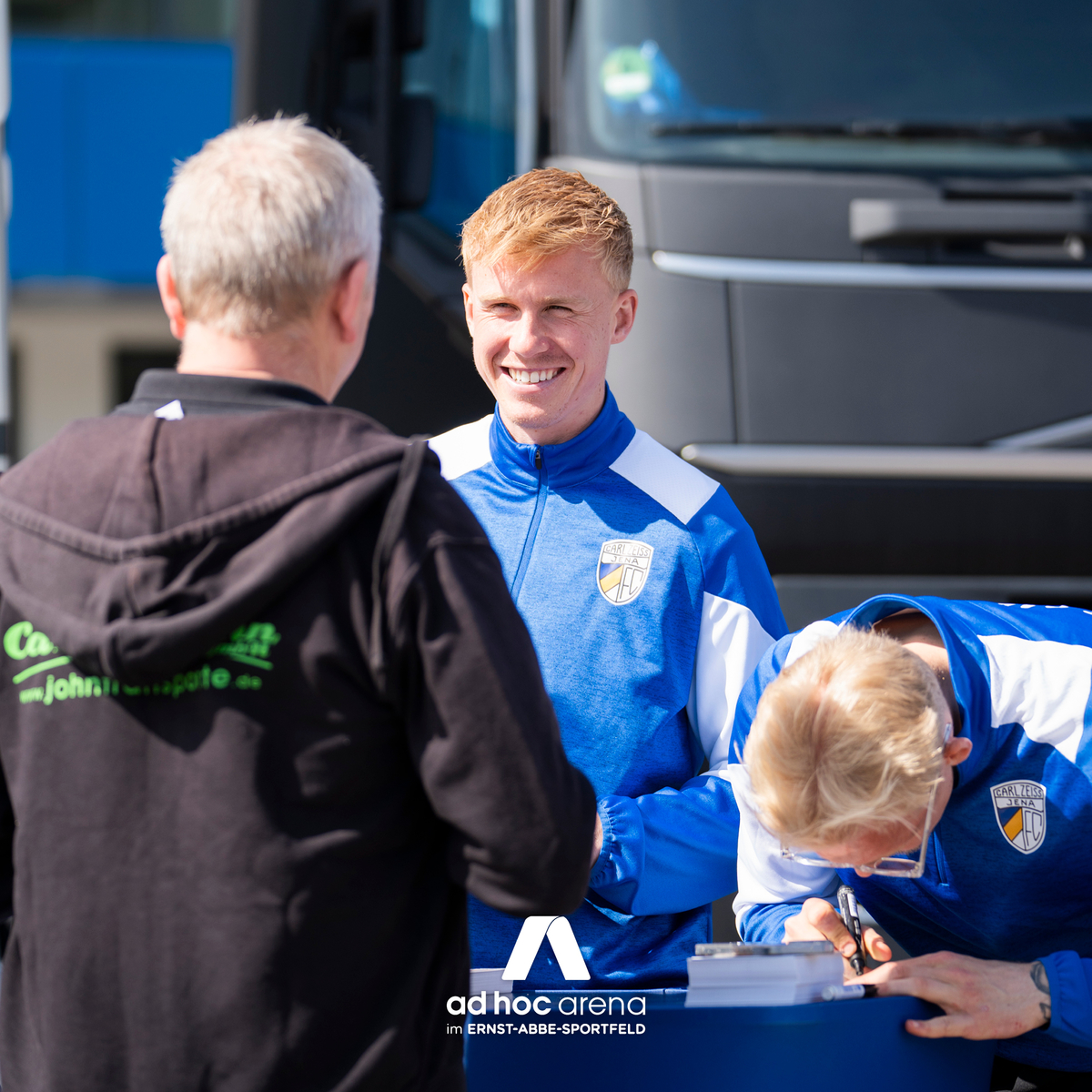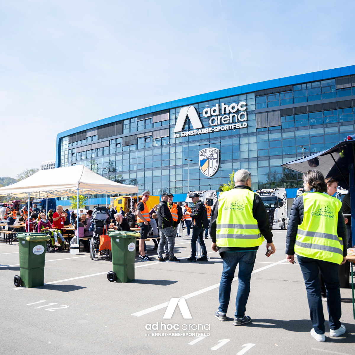 Die Kinder hatten die Möglichkeit, die Fahrzeuge aus nächster Nähe zu erleben und selbst in die Fahrerhäuser zu steigen. Ergänzt wurde das Programm durch Feuerwehr, Rettungsdienst und Polizei, die ihre Arbeit präsentierten, ebenso wie ein kleiner Stand des FC Carl Zeiss Jena, an dem zwei Spieler vor Ort waren und die Kinder herzlich empfingen.